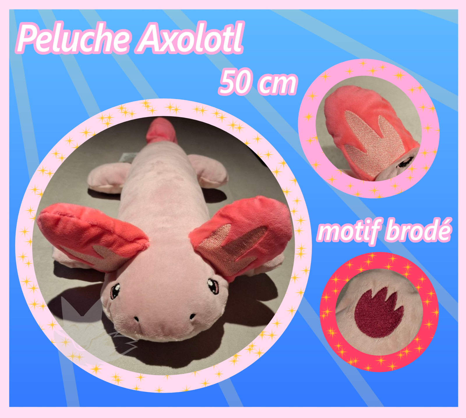 Une peluche inspiré de l’axolotl de 50 cm de long avec des motifs brodé en tissus winky (imitation velour).